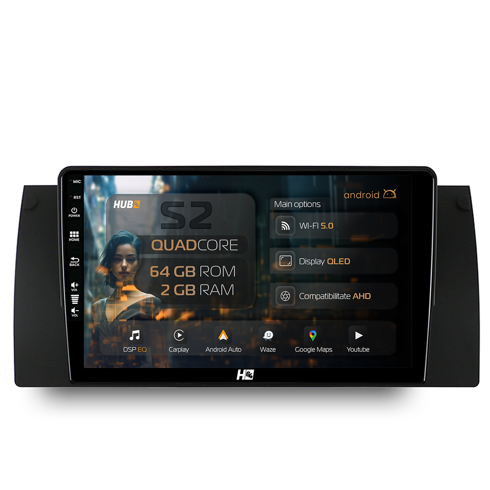 Navigatie HUB64 BMW E39/E53/E38, 2GB RAM, Android, GPS, Wi-FI, Carplay, Android Auto, USB, Bluetooth, Radio, Waze, Touchscreen, 9 inch