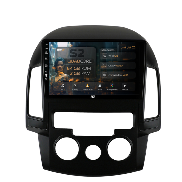 Navigatie HUB64 Hyundai I30 (2007-2012), Clima Manuala, 2GB RAM, Android, GPS, Wi-FI, Carplay, Android Auto, USB, Bluetooth, Radio, Waze, Touchscreen, 9 inch
