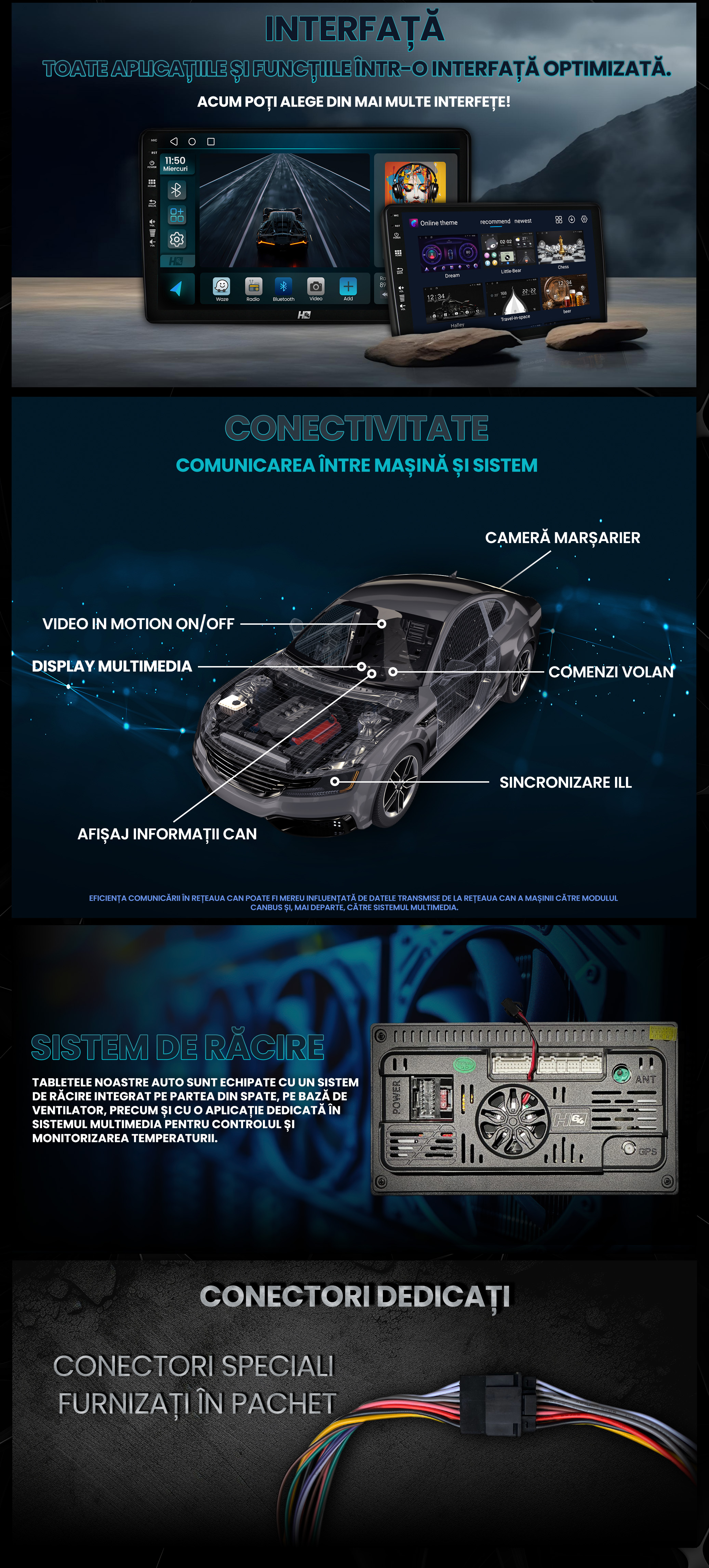 *Unele autoturisme pot necesita adaptări speciale, de exemplu un alt tip de chenar de încadrare sau conector alimentare. Aceste aspecte se discuta înainte de achiziție dacă este cazul și se pot remedia pe parcurs împreună cu suportul tehnic. Firma noastră își rezervă dreptul de a nu onora o comandă dacă consideră că un produs nu este cel puțin 95% compatibil și conform cu autoturismul în caz, indiferent de decizia clientului.